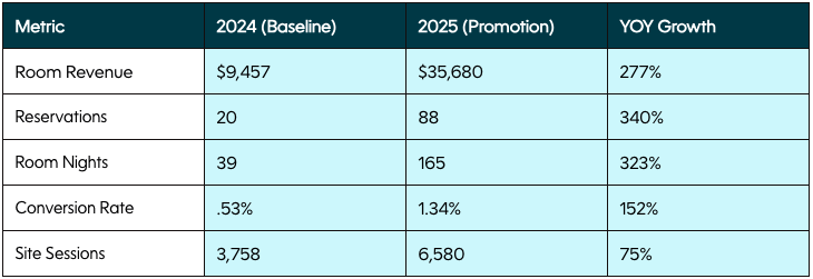 - Partner Success: Top-performing properties like Jasper Inn & Suites ($10,573 in revenue) and Marmot Lodge ($4,643 in revenue) demonstrated the power of a unified destination front.