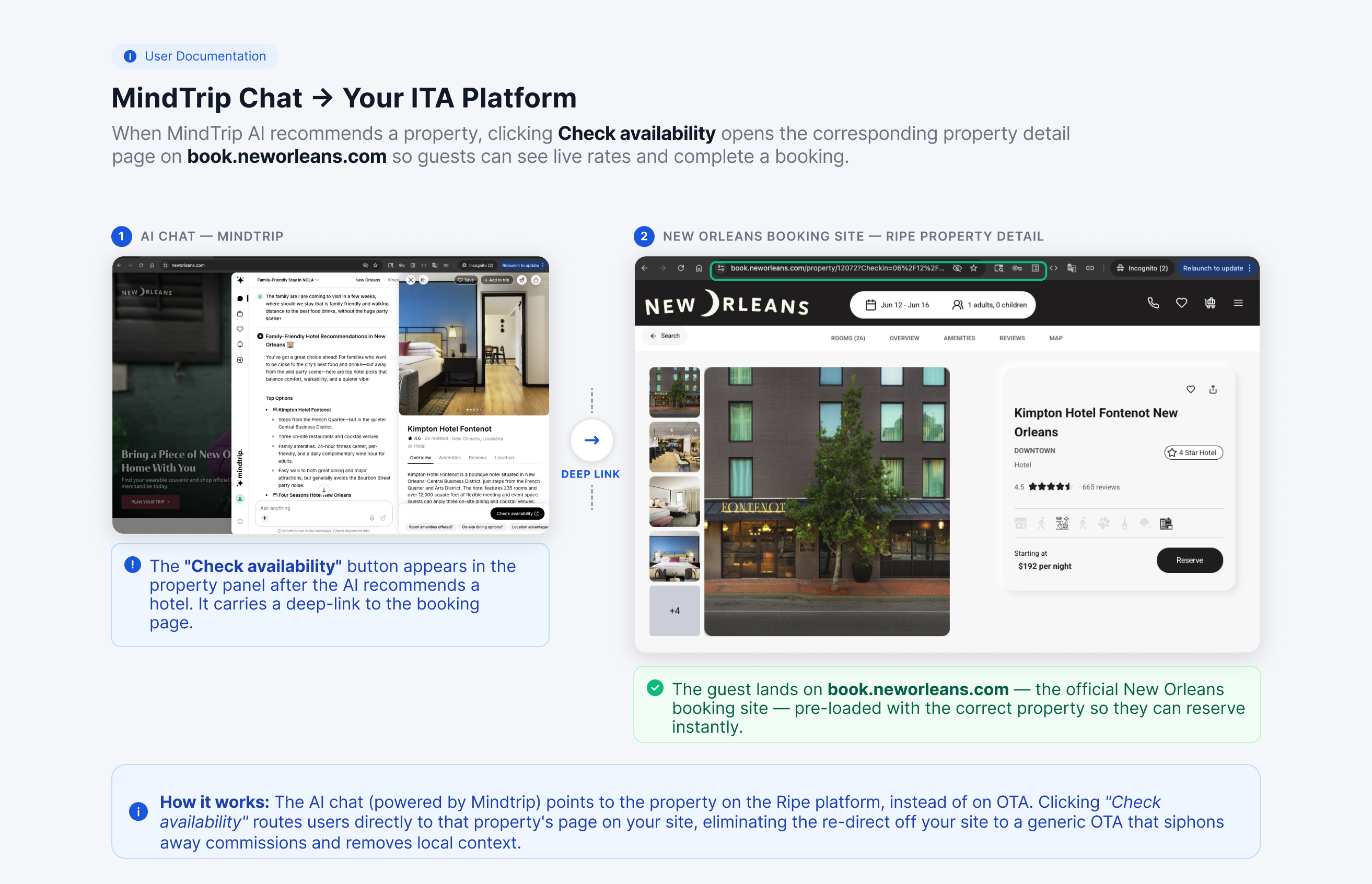 By default, many AI tools point users toward major Online Travel Agencies (OTAs) to fulfill lodging requests. This integration changes that flow. When a traveler engages with MindTrip, the AI recommends your trusted property partners based on your Ripe inventory.