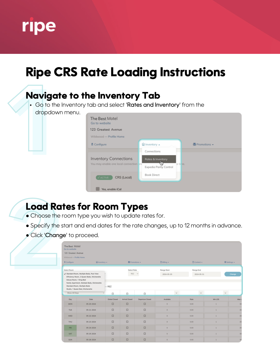 Ripe CRS Rate Loading Instructions Please contact [email protected] with any questions or if you need help.Updated about 3 hours ago Webrez Pro Supplier Setup GuideProperty / Hotel Listing Request