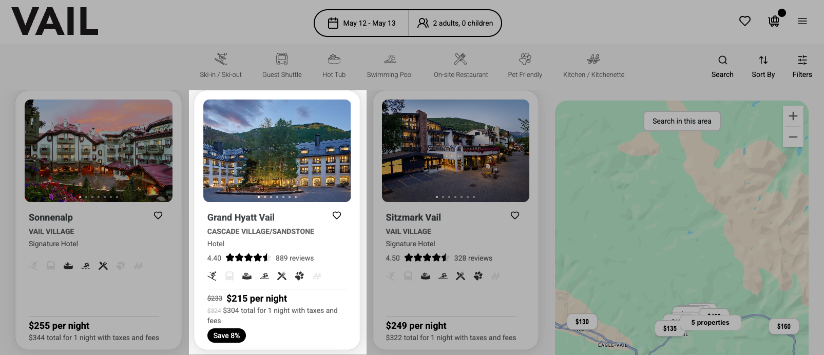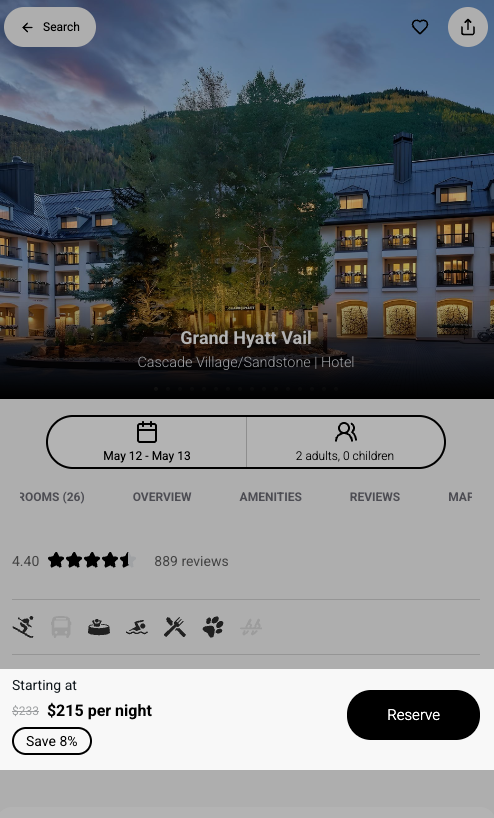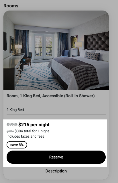 This treatment carries through from search results to the property detail page, and down to the room level where rate-level data is available.